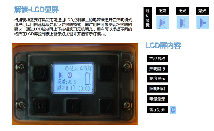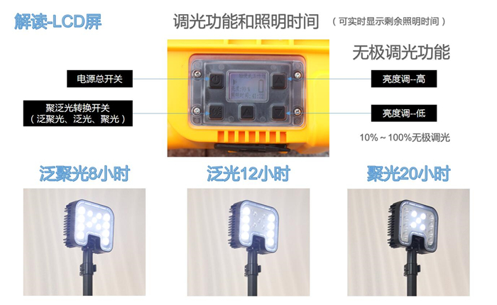 4、針對不同的照明模式,可手動進行10-100%的無極調光,同時可在LCD顯示屏上直觀的顯示剩余電量,預算可繼續工作時間。