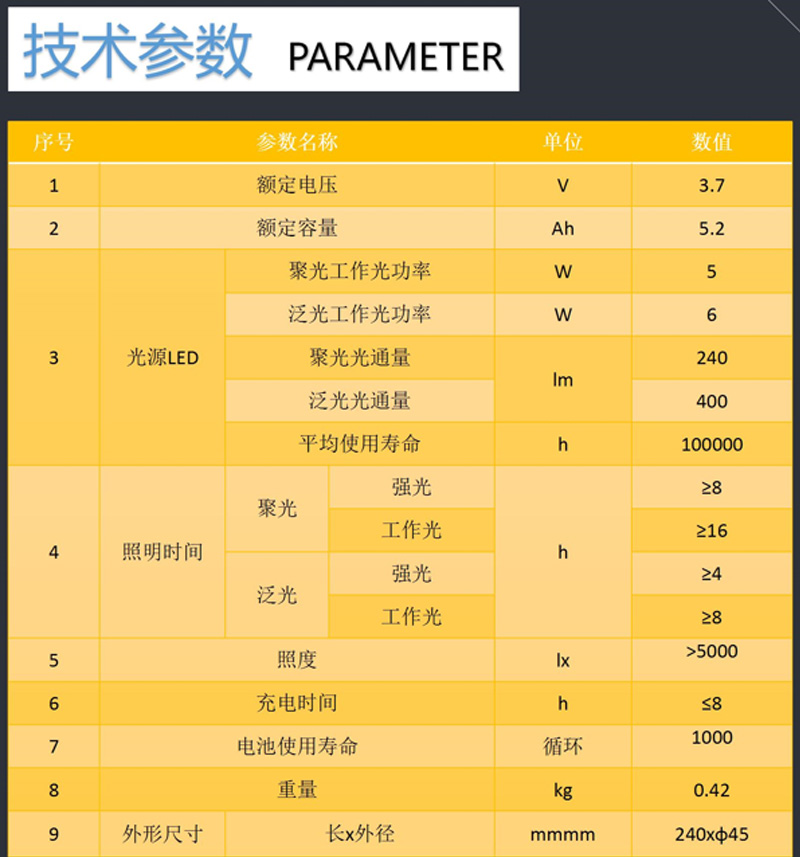 采用兩節高能無記憶18650鋰電池組,高能量密度、容量大達5000mah、經濟環保無污染、可循環使用,良好的高低溫性能、壽命長、安全可靠,并帶有USB輸出充電功能。手電連續照明時長可達16小時以上。