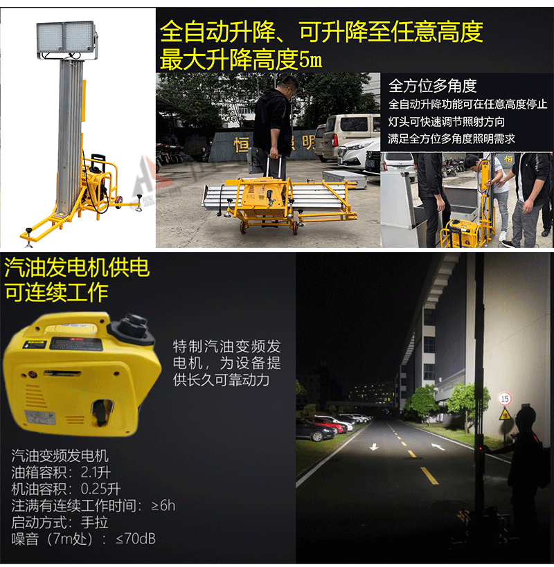 它采用變頻靜音汽油發電機,手啟動、低噪音,高可靠,使用維護方便;一次注滿油可連續工作6個小時以上;燈具也可接通市電實現長時間照明。