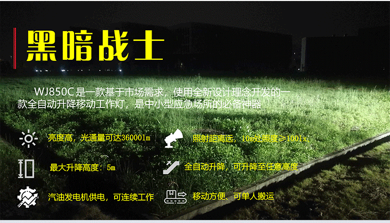 經過我們恒盛照明對市場的用戶需求調查了解到,一些工礦企業,消防單位,防汛現場,搜救現場,夜間施工等行業,在夜間工作時有時候會遇到燈具取電照明困難等問題,而且一般的燈具無法滿足其照射高度和照射亮度的需求,根據這些用戶的反饋,我公司設計部經過大膽的設想,把發動機、燈具和升降桿組合在一起,形成了WJ850C的雛形,經過我們現場實際使用不斷的測試,讓其更加方便使用經過反復的測試修改,就是今天我們介紹的產品黑暗戰士WJ850C,從此不懼黑暗,夜如白晝。