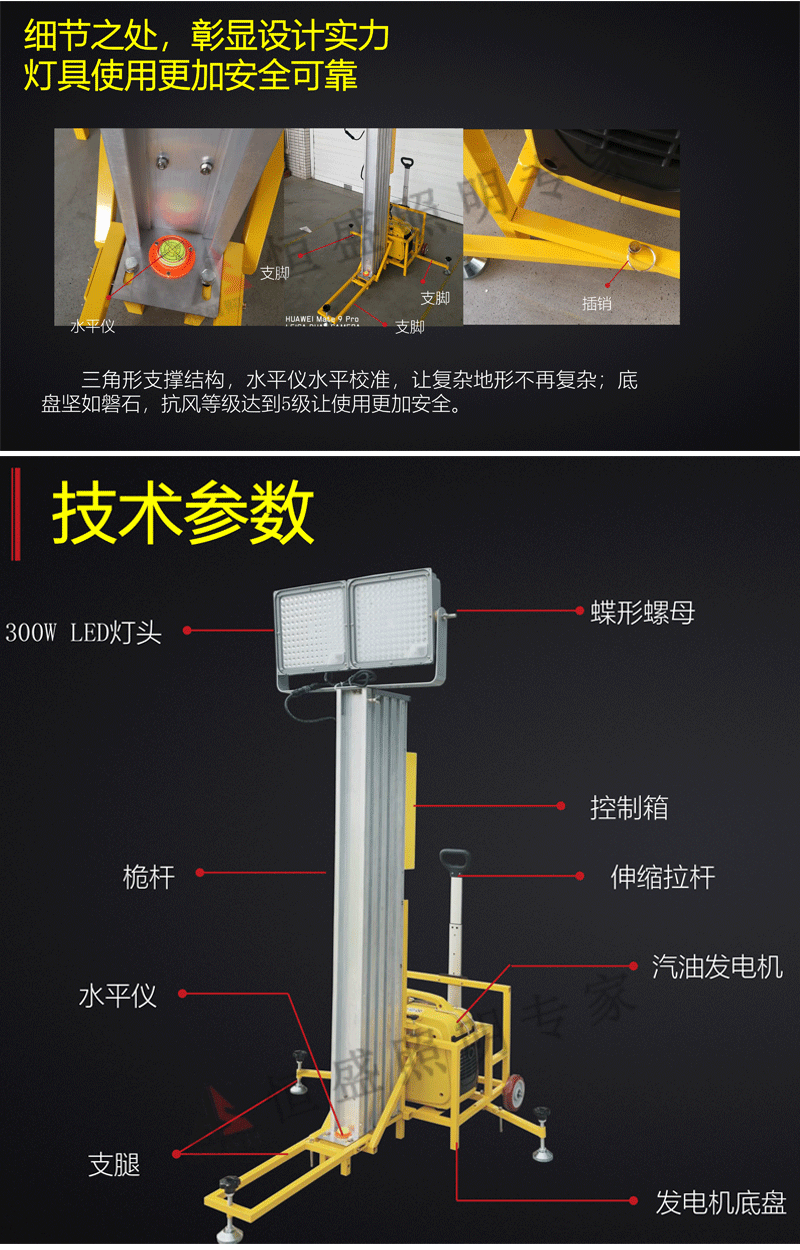 細節之處彰顯設計實力,燈具使用更加安全可靠。三角形支撐結構,水平儀水平校準,讓復雜地形不再復雜;底盤堅如磐石。抗風等級達到7級讓使用更加安全。