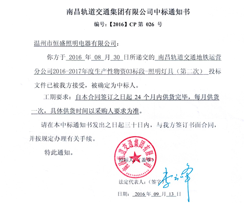 近日,通過各方努力,大家共同奮斗,恒盛照明企業接到南昌地鐵項目中標通知書,獲得為期兩年的地鐵運營燈具合約。全文如下: