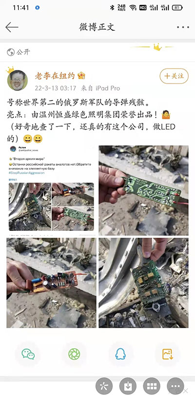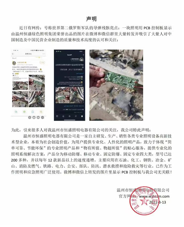 近日有網傳:號稱世界第二俄羅斯軍隊的導彈殘骸亮點:一塊照明用PCB控制板顯示由溫州恒盛綠色照明集團榮譽出品的圖片在微博和微信群里大量轉發并吸引了大量人對中國制造及中國民營企業制造的質量和技術高度的認可和關注: